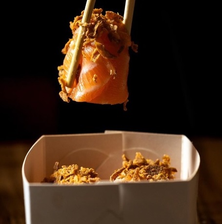 Joe CrispyTiras de salmão enrolado no arroz, salmão ba(Medio) R$ 22,00 / (Grande) R$ 36,00