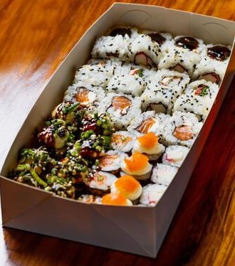Combinado Love4 hot couve, 4 hot philadelphia, 4 selado, 4 uramaki philadelphia, 4 hossomami de salmão kani, 4 hot doritos, 4 niguiri, 4 joe, 6 hot kitamaki, 6 fa_as de sashimi salmão, 4 harumaki com creme de avelãR$ 150,00