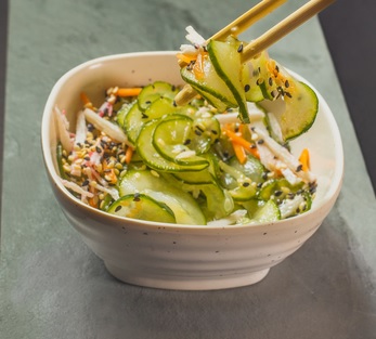 Salada agridoce de pepino, cenoura e kani