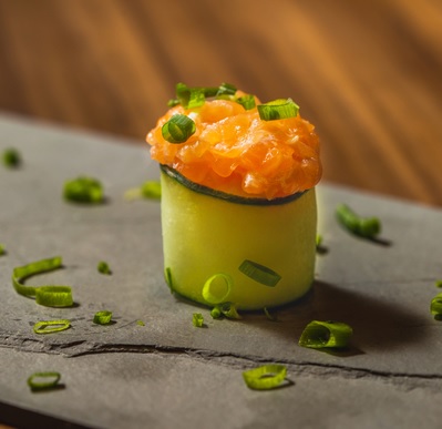 Joe PepinoTiras de pepino enrolado com arroz e salmão picadinho(Medio (4 Un.)) R$ 20,00 / (Grande (8 Un.)) R$ 34,00