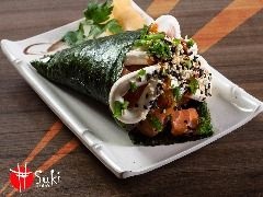 Temaki SukiSalmão, cream cheese, amêndoas, gergelim e raspa de limão siciliano(Medio) R$ 28,00 / (Grande) R$ 41,00